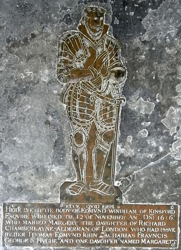 | Keywords: EdmundWyndham Died1616 WatchetChurch Somerset.PNG en Edmund Wyndham Esq d 1616 married Margery Chamberlayne His monumental brass survives in St Decuman's Church Watchet before the high altar inscribed as follows Ecce quid eris Here lyeth the body of Edmund Windham of Kinsford Esquire who died the 12 of November An no D omi ni 1616 who maried Margery the daughter of Richard Chamberlayne Alderman of London who had issue by her Thomas Edmund John Zacharias Frauncis George Hughe and one daughter named Margarett The brass is set into a large slab in the corners of which are also 4 heraldic shields own photo Lobsterthermidor <span class signature-talk ></span> 17 18 19 April 2015 UTC 2013 Church of Saint Decuman in Watchet interior Monumental brasses in Somerset |
