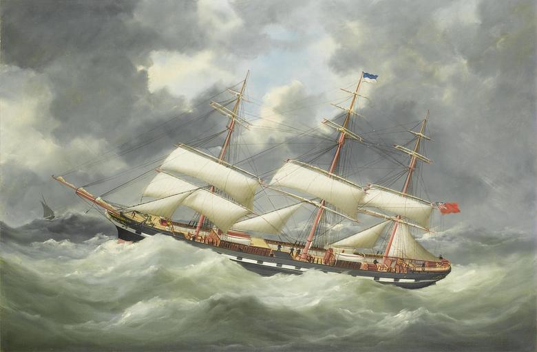 | Keywords: Édouard Adam - The Atalanta running under reduced sail in a gale.jpg Édouard Adam 1847-1929 after 1885 oil canvas cm 61 91 4 accession number object history credit line exhibition history Ed Adam Havre 1881 ~ lower right signature / date The very last true clipper ship to be launched from Robert Duncans yards at Port Glasgow in 1885 was Atalanta Ordered for Mr Ninian Hill of Greenock she was registered there at 1 753 tons gross 1 693 net and measured 265 feet in length with a 40 foot beam Mostly employed in the Java sugar trade she had a tremendous turn of speed and logged 320 and 325 miles in consecutive days whilst on passage from Cardiff to Singapore in 1886 These remarkable runs were followed by many more during her career and since both her owner and her master were unstinting in their care of her she was frequently complimented on her matchless appearance Often referred to as šthe beautiful Atalanta ˜ on her last homeward passage she caused a sensation by sailing right up to her anchorage at the Tail of the Bank under full canvas much to the admiration of a party of naval officers who witnessed her smart handling Sadly her career proved short-lived and she was wrecked off the coast of Oregon on 17th November 1898 with the loss of her captain and 22 of her crew <ref>http //www bonhams com/auctions/16760/lot/49/ Bonhams</ref><ref>http //www clydesite co uk/clydebuilt/viewship asp id 16955 clydesite co uk</ref><small> reflist </small> http //www bonhams com/auctions/16760/lot/49/ Bonhams London 2009 03 24 lot 49 PD-old-auto-1923 1926 DEFAULTSORT Adam Edouard; Atalanta 1885 Édouard Adam 19th-century sailing ships in paintings Atalanta ship 1885 Paintings not categorised by year Images from Bonhams |