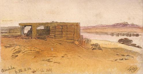 Keywords: Edward Lear - Amada, 6-50 am, 12 February 1867 (419) - Google Art Project.jpg inscribed in brown ink lower left Amada 6 50 AM Feby 12 1867 ; in graphite lower right 419 ; Verso in graphite center 241 Not on View Watercolor with pen in brown ink over graphite on thick rough cream wove paper architectural subject sky sand rocks water temple ruins river landscape desert special url_id BwHZoV4FJQIyUA PD-old-100-1923 1888 Egypt by Edward Lear Temple of Amada Amada Google Art Project works by Edward Lear