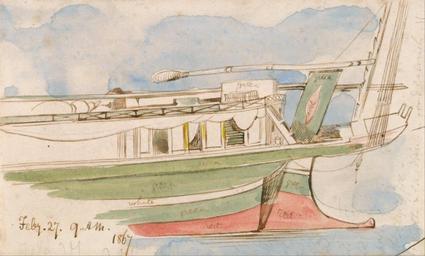 | Keywords: Edward Lear - Boat on the Nile - Google Art Project (2425538).jpg inscribed in brown ink lower left Feby 27 9 AM 1867 ; Verso in graphite center 153 up Lowest Not on View Watercolor with pen in brown ink over graphite on medium sligtly textured cream wove paper windows river marine art flag boat special url_id twH9T2GzY6MzUw PD-old-100-1923 1888 Egypt by Edward Lear Nile in art Google Art Project works by Edward Lear Egyptian feluccas in art | ||||