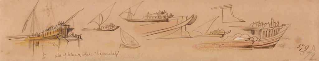 | Keywords: Edward Lear - Boats on the Nile - Google Art Project.jpg inscribed in brown ink lower right 97 ; Verso in graphite upper left 20 up Top Not on View Watercolor with pen in brown ink and gouache over graphite on moderately thick slightly textured blue wove paper sails studies visual works figures representations genre subject boats special url_id WwFo-s-MaEUwKw PD-old-100-1923 1888 Egypt by Edward Lear Nile in art Google Art Project works by Edward Lear | ||||