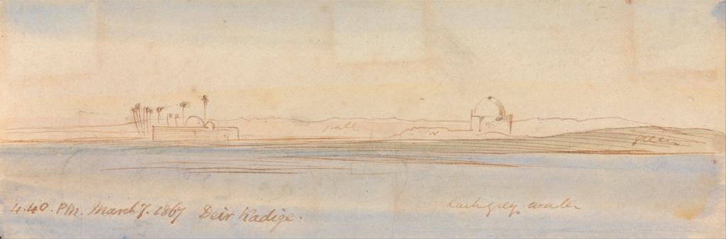 | Keywords: Edward Lear - Deir Kadige - Google Art Project.jpg Inscribed in artist's hand in pen and brown ink center pale w ; in artist's hand in pen and brown ink center right green ; in artist's hand in pen and brown ink lower left 4 40 PM March 7 1867 Deir Kadige ; in artist's hand in pen and brown ink lower right dark grey water Inscription _Signed_and_Dated not signed Not on View Watercolor with pen and brown ink and graphite on medium slightly textured cream wove paper palm trees water domes river structures single built works buildings landscape desert special url_id HgEu8uIaoixeVQ PD-old-100-1923 1888 Egypt by Edward Lear Google Art Project works by Edward Lear |