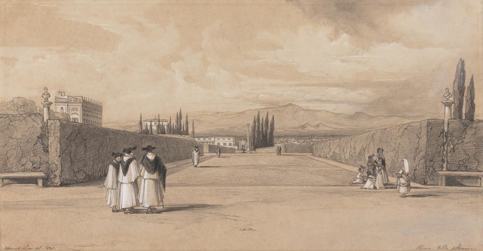 | Keywords: Edward Lear - The Gardens of the Villa Albani - Google Art Project.jpg  Inscribed in artist's hand in pen and black ink lower left Edward Lear del 1840 ; in artist's hand in pen and black ink lower right Roma Villa Albani ; inscribed on back in graphite center right 5 Inscription _Signed_and_Dated Signed in pen and black ink lower left Edward Lear del 1840 Not on View Graphite black chalk and white gouache on medium slightly textured brown wove paper walls columns trees gardens landscape special url_id ywEtJMuORwnZuw PD-old-100-1923 1888 Watercolor paintings by Edward Lear Google Art Project works by Edward Lear |
