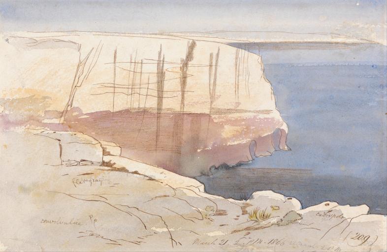 Keywords: Edward Lear - Gozo, near Malta - Google Art Project.jpg Inscribed in artist's hand with pen in brown ink lower right March 21 2 pm 1866 209 '; in graphite lower right 22 March 2 pm Gozo; pen in brown ink lower left flat-gray Cowoloulice Not on View Watercolor with pen in brown ink over graphite on thick rough cream wove paper rocks water grass cliffs landscape special url_id dQFPtVxR00tX4g PD-old-100-1923 1888 Google Art Project works by Edward Lear Malta by Edward Lear 1866 in Malta Cliffs of Malta Gozo |