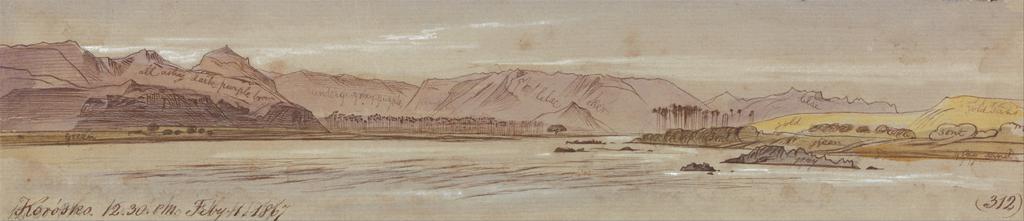 | Keywords: Edward Lear - Korosko - Google Art Project.jpg inscribed in brown ink lower left Koroska 12 30 PM Feby 1 1867 ; in brown ink 312 ; Verso in graphite center 80 up next above B Not on View Watercolor with pen in brown ink and gouache over graphite on moderately thick moderately textured gray wove paper sky palm trees water river mountains islands landscape special url_id 5AFhXl4YSEweuw PD-old-100-1923 1888 Egypt by Edward Lear Google Art Project works by Edward Lear Nubia in art | ||||