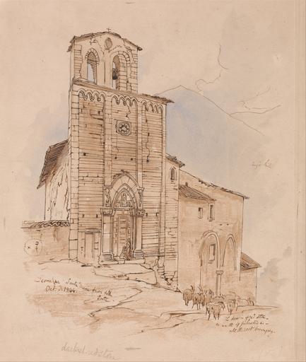 Keywords: Edward Lear - Leonessa, 3 October 1844 - Google Art Project.jpg Inscribed in brown ink lower left Leonessa Santa Maria fuori della Porta Oct 3 1844 ; in brown ink lower right The door is stone- line of illegible inscriptions all the east Not on View Watercolor with pen in brown ink over graphite on moderately thick slightly textured beige wove paper architectural subject herd wall door windows archways figures building bell special url_id bQGoPsNKURN5fA PD-old-100-1923 1888 Watercolor paintings by Edward Lear Google Art Project works by Edward Lear |