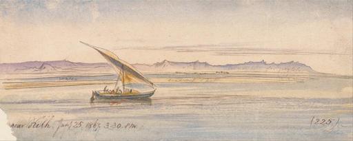 Keywords: Edward Lear - Near Kilh - Google Art Project.jpg inscribed in brown ink lower left near Kilh Jany 25 1867 3 30 PM ; in brown ink lower right 225 Not on View Watercolor with pen in brown ink over graphite on medium slightly textured wove paper mounted on thick slightly textured cream wove paper sky water river riverbank sail figures representations landscape marine art boat special url_id bAGydej4JLGAsA PD-old-100-1923 1888 Egypt by Edward Lear Google Art Project works by Edward Lear Egyptian feluccas in art