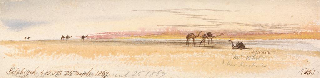 | Keywords: Edward Lear - Salahiyeh - Google Art Project (2314769).jpg inscribed in brown ink lower left Salahiyeh 6 35 PM 25 March 1867 ; in brown ink lower right 15 ; Verso in graphite upper right 356 Not on View Watercolor with pen in brown ink over graphite on wove paper on thick rough cream wove paper sky camels mammals sand landscape special url_id 1gEbyReaQcD-6Q PD-old-100-1923 1888 Egypt by Edward Lear Google Art Project works by Edward Lear History of Syria | ||||