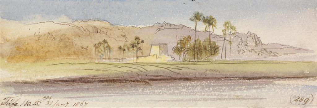 Keywords: Edward Lear - Tafa, 10-15 am, 31 January 1867 (289) - Google Art Project.jpg inscribed in brown ink lower left Tafa 10 15 AM 31 Jany 1867 ; in brown ink lower right 289 ; Verso in graphite center 185 encircled Not on View Watercolor with pen in brown ink over graphite on thick moderately textured cream wove paper sky palm trees temple ruins river riverbank landscape special url_id swGu90vwLCQE6w PD-old-100-1923 1888 Egypt by Edward Lear Google Art Project works by Edward Lear