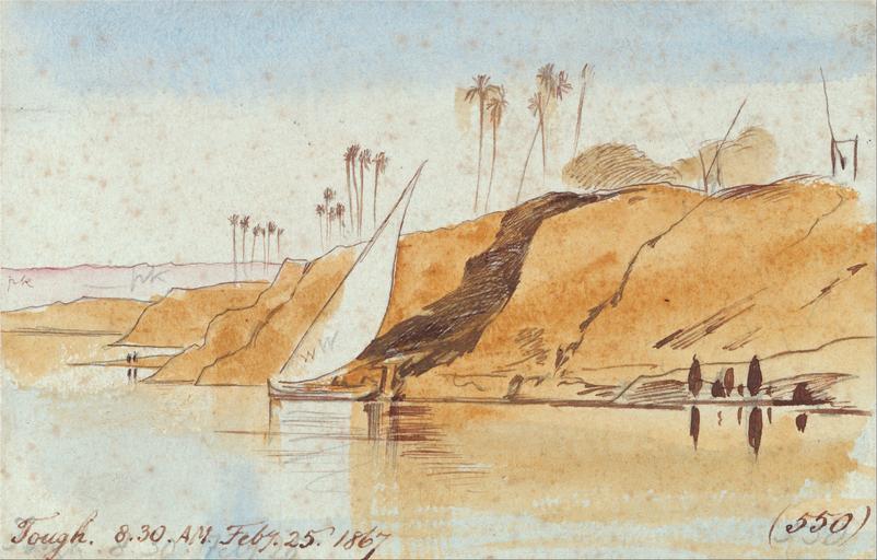 | Keywords: Edward Lear - Tough - Google Art Project.jpg inscribed in brown ink lower left Tough 8 30 AM Feby 25 1867 ; in brown ink lower right 550 ; Verso in graphite center 289 597 Not on View Watercolor with pen in brown ink over graphite on medium slightly textured cream wove paper mounted on thick moderately textured cream wove paper palm trees sand river riverbank hills sail figures representations landscape marine art boat special url_id sQEQDq3SuTnOuQ PD-old-100-1923 1888 Egypt by Edward Lear Google Art Project works by Edward Lear Naqada Egyptian feluccas in art |