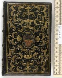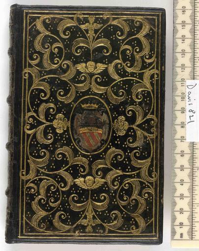 Keywords: Effetti mirabili de la Limosina et sentenze degne di memoria appertenenti ad essa - Upper cover (Davis821).jpg Style Armorial Cherubs head Semis background of small tools Azured or hatched motifs; Caption Upper cover; Colour Black; Edge Gilt exhibition history Decorative Technique Tooled in gold Painted; Cover Material Goatskin includes morocco turkey etc Sewn on 4 tanned leather supports laced in 4 raised spine bands object history Text 1586; Rome; Orsini object type Cc-zero place of creation Binding Italy place of discovery See M M Foot The Henry Davis Gift Vol III London 2010 British Library image http //www bl uk/catalogues/bookbindings/LargeImage aspx RecordId 020-000005008 ImageId ImageId 42109 Copyright BL Effetti mirabili de la Limosina et sentenze degne di memoria appertenenti ad essa Uploaded with GWToolset Effetti mirabili de la Limosina et sentenze degne di memoria appertenenti ad essa - Upper cover Davis821 http //www webarchive org uk/bldatasets/bindings/6686_4 jpg Bookbinding 16th-century bookbinding British Library Bookbindings |