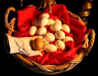 Keywords: eggs basket chicken bird wicker white brown food embryo shell yolk symbolic farm agriculture nutrition nourishment