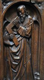 Keywords: Eglise Orbais-l'Abbaye 2011 stalles jouee 3.jpg fr Stalles de l'église Saint-Pierre-et-Saint-Paul à Orbais l'Abbaye sculptées par Jean Huilier et offertes en 1520 par Louis de Bourbon abbé du couvent Une jouée Saint Thomas own Vassil 2011-02-13 Cc-zero Choir stalls of abbatiale Saint-Pierre d'Orbais-l'Abbaye Reliefs of Saint Thomas |