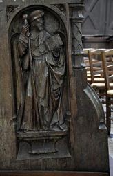 Keywords: Eglise Orbais-l'Abbaye 2011 stalles jouee 4.jpg fr Stalles de l'église Saint-Pierre-et-Saint-Paul à Orbais l'Abbaye sculptées par Jean Huilier et offertes en 1520 par Louis de Bourbon abbé du couvent Une jouée Saint Jacques le Majeur own Vassil 2011-02-13 Cc-zero Choir stalls of abbatiale Saint-Pierre d'Orbais-l'Abbaye Reliefs of Saint James the Greater in France |