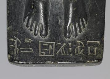 Keywords: Egyptian - Block Statue of Kha-em-Waset - Walters 2268 - Detail B.jpg This piece is a small serpentine New Kingdom block statue of Kha-em-Waset Kha-em-Waset was a noble who held the titles of Fan-Bearer and Chief of Works in the Temple of Amun This statue would have been placed as a votive in the temple of Amun Kha-em-Waset sits with his knees drawn up upon a rectangular bench which in turn rests upon a rectangular base The back right corner of the base is missing There is a rectangular back plinth behind him He wears a long smooth ankle-length garment The outlines of his legs are visible in profile and his arms are visible within the garment as well His arms are folded and hands rest flat upon his upper arms An insignia on his upper right arm identifies him as belonging to the Temple of Amun There are two vertical columns of hieroglyphics text on the front of his garment and on the back plinth A single horizontal band of text surrounds the base His wig is a New Kingdom combination of delicate wavy strands over plaited curls His eyes are large and recall the orientalized almond-shaped eyes of Amenhotep III His lips are thick and form a slight smile His ears are unusually pointed He has a short squared beard ca 1370 1360 BC New Kingdom black serpentine cm 8 6 4 1 6 1 accession number 22 68 17604 Dikran Kelekian New York and Paris Henry Walters Baltimore date of acquisition unknown by purchase Walters Art Museum Henry Walters Acquired by Henry Walters Translation All things which go forth on the offering table of Amun lord of coolness and dryness for the fan-bearer Kha-em-Waset; Translation The true admirable one of good character of kindly manners who is not negligent the fan bearer of the troop Beautiful is the yeomanry Kha-em-Waset; Translation An offering which the king gives to Amun-Re King of the gods that he may give a good life to him who is devoted to him and puts himself upon his face the fan-bearer Kha-em-Waset An offering which the king gives to Amun-Re lord of coolness and dryness that he may give a good life in following him until he reaches the age in goodness to the fan-bearer Kha-em-Waset //// the Chief of the works in the Temple of Amun Mark Temple of Amun place of origin Temple of Amun-Re in Karnak Egypt Walters Art Museum license Ancient Egyptian block statues in the Walters Art Museum Statues of the 19th dynasty of Egypt Statues from Karnak temple complex Thebes emblem hieroglyph Hieroglyphs on plinths Man with basket on head hieroglyph