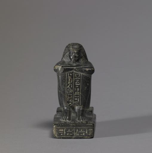 | Keywords: Egyptian - Block Statue of Kha-em-Waset - Walters 2268.jpg This piece is a small serpentine New Kingdom block statue of Kha-em-Waset Kha-em-Waset was a noble who held the titles of Fan-Bearer and Chief of Works in the Temple of Amun This statue would have been placed as a votive in the temple of Amun Kha-em-Waset sits with his knees drawn up upon a rectangular bench which in turn rests upon a rectangular base The back right corner of the base is missing There is a rectangular back plinth behind him He wears a long smooth ankle-length garment The outlines of his legs are visible in profile and his arms are visible within the garment as well His arms are folded and hands rest flat upon his upper arms An insignia on his upper right arm identifies him as belonging to the Temple of Amun There are two vertical columns of hieroglyphics text on the front of his garment and on the back plinth A single horizontal band of text surrounds the base His wig is a New Kingdom combination of delicate wavy strands over plaited curls His eyes are large and recall the orientalized almond-shaped eyes of Amenhotep III His lips are thick and form a slight smile His ears are unusually pointed He has a short squared beard ca 1370 1360 BC New Kingdom black serpentine cm 8 6 4 1 6 1 accession number 22 68 17604 Dikran Kelekian New York and Paris Henry Walters Baltimore date of acquisition unknown by purchase Walters Art Museum Henry Walters Acquired by Henry Walters Translation All things which go forth on the offering table of Amun lord of coolness and dryness for the fan-bearer Kha-em-Waset; Translation The true admirable one of good character of kindly manners who is not negligent the fan bearer of the troop Beautiful is the yeomanry Kha-em-Waset; Translation An offering which the king gives to Amun-Re King of the gods that he may give a good life to him who is devoted to him and puts himself upon his face the fan-bearer Kha-em-Waset An offering which the king gives to Amun-Re lord of coolness and dryness that he may give a good life in following him until he reaches the age in goodness to the fan-bearer Kha-em-Waset //// the Chief of the works in the Temple of Amun Mark Temple of Amun place of origin Temple of Amun-Re in Karnak Egypt Walters Art Museum license Ancient Egyptian block statues in the Walters Art Museum Statues of the 19th dynasty of Egypt Statues from Karnak temple complex |