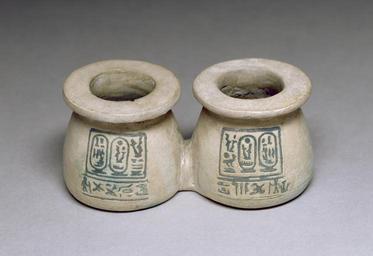 Keywords: Egyptian - Conjoined Jars - Walters 48457.jpg Multivessel ensembles are documented in ancient Egypt during all periods but they are particularly abundant in the New Kingdom and Late Period contexts Each of these conjoined vessels has a squat conical form tapering upward a flat bottom and a protruding lip The vessels are joined at their lower halves; traces of breakage on the side opposite the inscriptions indicate that they may have been part of an ensemble of four of more vessels Inscriptions of dark blue faience paste are inset on the front of the vessels Each inscription is composed in three columns in a rectangular frame containing the throne and birth name of Sety I Men-Maat-Re; Sety beloved of Re as well as the epithets beloved of Maat who is named Daughter of Re on the right vessel and Mistress of the Two Lands on the left vessel A line below each frame gives the name and titles of the owner of the ensemble Paser the title mentioned on the right is priest of Maat and on the left governor of the city and vizier ca 1285 BC New Kingdom Egyptian faience silica copper cm 3 7 8 5 4 3 accession number 48 457 22270 Dikran Kelekian New York and Paris date and mode of acquisition unknown Henry Walters city Baltimore Walters Art Museum Henry Walters Acquired by Henry Walters 1926 place of origin Western Thebes Egypt Walters Art Museum license Ancient Egyptian pottery in the Walters Art Museum Seti I Media contributed by the Walters Art Museum needs category review |