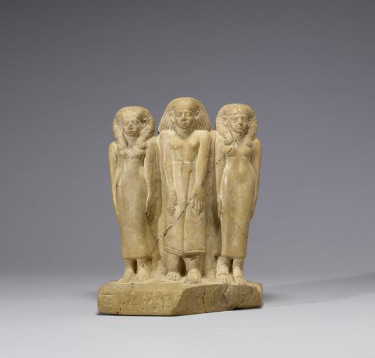 Keywords: Egyptian - Family Group of Three - Walters 22349.jpg This piece is a Middle Kingdom limestone triad consisting of a central male figure flanked by two women The central position of the male figure illustrates his elevated status over the women It is assumed that the people are all related but the exact relationships are uncertain due to the incomplete state of the inscription The statue is inscribed on the base with a brief standard offering formula and the names of two of the individuals All three figures have long arms and rather wide feet They all share the same idealized facial features including heavy hooded eyes and mouths that droop down at the corners The brow lines are quite straight and the foreheads are broad These features echo the severity seen in royal portraiture of the time The male figure wears a long wrapped garment which is tied at his waist He stands with his left foot forward and his arms hang straight with both hands flat upon the fronts of his thighs His striated wig pushes his large ears forward Both women stand with their feet together and their hands rest flat against the sides of their thighs They wear ankle length sheath gowns cut below the breasts with two wide shoulder straps Their tripartite wigs are plaited and gathered at the back of the head The wig lappets fall over the shoulders and curl outward at the ends in imitation of the wig worn by the goddess Hathor The front left corner of the base is missing A major crack cuts diagonally across the feet of the figures The surface of the base is slightly raised beneath the feet of the male figure Statue groups representing families in various combinations or sequences were a common theme in ancient Egyptian art Whereas in Old Kingdom statues the sizes of the individuals signaled their relative importance and their relationship Middle Kingdom statue groups are characterized by more naturalistic depictions This sculpture is further characteristic of Middle Kingdom group statuary with its back support emphasized hands and feet large ears and heavy wigs ca 1850 1800 BC Middle Kingdom carved limestone cm 20 15 1 8 7 accession number 22 349 35311 Dikran Kelekian New York and Paris Henry Walters city Baltimore Walters Art Museum 1931 by bequest Acquired by Henry Walters 1931 Translation A mortuary offering granted by the king and composed of bread beer oxen and fowl for the Ka i e the creative and sustaining life power of -Sobek born of Dedet-Sobek and for Aw born of Senet place of origin Egypt Walters Art Museum license Ancient Egyptian statuettes in the Walters Art Museum Statues of the Egyptian Middle Kingdom Statues of three people |