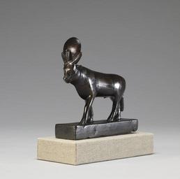 Keywords: Egyptian - Figure of the Apis Bull - Walters 54538 - Three Quarter Left.jpg The Apis bull was associated with the creator god Ptah and with the rituals for the king His main place of worship was Memphis After the death of the Apis bull he was mummified and buried in a special cemetery Figures of Apis bulls were donated during the Late and Greco-Roman periods into temples This bronze figure displays the bull on a base He has a sun-disk between his horns combined with a uraeus cobra serpent The carving on its body displays a collar a winged sun-disk on the shoulders and a cloth with a hatched pattern on the back ca 600 500 BC Late Period bronze cm 12 07 11 43 accession number 54 538 22399 Henry Walters Baltimore date and mode of acquisition unknown Walters Art Museum Henry Walters Acquired by Henry Walters Translation The Apis the Horus giving life to Pesometik son of Pedy-wesr made of Neb-hetef Egypt in Africa Indianapolis Museum of Art Indianapolis 1996 place of origin Egypt Walters Art Museum license Ancient Egyptian statuettes in the Walters Art Museum Statues of Apis Media contributed by the Walters Art Museum needs category review |