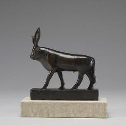 Keywords: Egyptian - Figure of the Apis Bull - Walters 54538 - Left.jpg The Apis bull was associated with the creator god Ptah and with the rituals for the king His main place of worship was Memphis After the death of the Apis bull he was mummified and buried in a special cemetery Figures of Apis bulls were donated during the Late and Greco-Roman periods into temples This bronze figure displays the bull on a base He has a sun-disk between his horns combined with a uraeus cobra serpent The carving on its body displays a collar a winged sun-disk on the shoulders and a cloth with a hatched pattern on the back ca 600 500 BC Late Period bronze cm 12 07 11 43 accession number 54 538 22399 Henry Walters Baltimore date and mode of acquisition unknown Walters Art Museum Henry Walters Acquired by Henry Walters Translation The Apis the Horus giving life to Pesometik son of Pedy-wesr made of Neb-hetef Egypt in Africa Indianapolis Museum of Art Indianapolis 1996 place of origin Egypt Walters Art Museum license Ancient Egyptian statuettes in the Walters Art Museum Statues of Apis Media contributed by the Walters Art Museum needs category review |