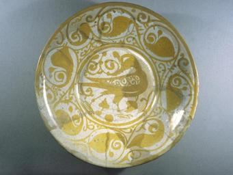 | Keywords: Egyptian - Lusterware Plate with Bird Motif - Walters 482036.jpg  Decorative lusterware was popular during the Fatimid Period 910-1171 The most important production place was in the cultural center of al-Fustad near the Fatimid capital al-Qahira Cairo This plate displays a typical motif of this time period a bird in a central roundel with leaves and branches and a broad frame with leaf arabesques Especially attractive are the variation of forms of the leaves and spiral-tendrils which modify the rhytmic pattern and the yellow-golden color of the painting century 11 Medieval earthenware with luster decoration and glaze cm 5 7 2 5 accession number 48 2036 20558 Estate of D G Kelekian Walters Art Museum 1951 by purchase Museum purchase 1951 place of origin Cairo Egypt Walters Art Museum license Islamic art in the Walters Art Museum Fatimid pottery Lustreware 11th-century pottery |
