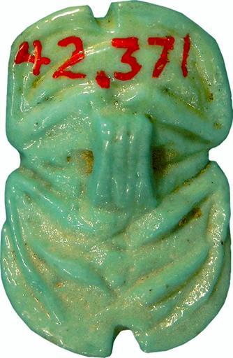 | Keywords: Egyptian - Naturalistic Scarab - Walters 42371 - Bottom.jpg The ancient Egyptians believed that the dung beetle the Scarabaeus sacer was one of the manifestations of the sun god Representations of these beetles were used as amulets and for ritual or administrative purposes Naturalistic scarabs such as this were used as part of the amulet set of the mummy They have a naturalistically formed belly and no additional inscriptions or motifs The highest point of the back of this scarab is the pronotum dorsal plate of the prothorax Pronotum and elytron wing cases are separated by a straight incised partition line; the wing cases have a vertical hatch line pattern nine lines on each side a central division line which ends V-shaped in a scutellum and U-shaped shoulder marks The proportions of the top are almost balanced but the pronotum is short in comparison to the elytron The triangular head is flanked by very small quarter-spherical eyes which protrude from the head; the side platesare irregularly trapezoidal and have hatch lines and clypeus front plate is four times serrated The detailed modeled extremities are slender and have natural form; central notches are at both side edges as well as the top and bottom edges The body structures of the bottom is modeled and a quarter-oval eye protrudes from the center of the belly The basic form of the scarab is long rectangular-oval The scarab is a funerary amulet with regenerative function and was attached to the mummy bandages between 664 525 BC Late Period light beige faience with light green glaze cm 1 1 5 2 3 accession number 42 371 38428 Henry Walters Baltimore date and mode of acquistiion unknown Walters Art Museum Henry Walters Acquired by Henry Walters place of origin Egypt Walters Art Museum license Ancient Egyptian scarabs in the Walters Art Museum Media contributed by the Walters Art Museum needs category review |