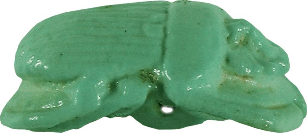 | Keywords: Egyptian - Naturalistic Scarab - Walters 42371 - Right.jpg The ancient Egyptians believed that the dung beetle the Scarabaeus sacer was one of the manifestations of the sun god Representations of these beetles were used as amulets and for ritual or administrative purposes Naturalistic scarabs such as this were used as part of the amulet set of the mummy They have a naturalistically formed belly and no additional inscriptions or motifs The highest point of the back of this scarab is the pronotum dorsal plate of the prothorax Pronotum and elytron wing cases are separated by a straight incised partition line; the wing cases have a vertical hatch line pattern nine lines on each side a central division line which ends V-shaped in a scutellum and U-shaped shoulder marks The proportions of the top are almost balanced but the pronotum is short in comparison to the elytron The triangular head is flanked by very small quarter-spherical eyes which protrude from the head; the side platesare irregularly trapezoidal and have hatch lines and clypeus front plate is four times serrated The detailed modeled extremities are slender and have natural form; central notches are at both side edges as well as the top and bottom edges The body structures of the bottom is modeled and a quarter-oval eye protrudes from the center of the belly The basic form of the scarab is long rectangular-oval The scarab is a funerary amulet with regenerative function and was attached to the mummy bandages between 664 525 BC Late Period light beige faience with light green glaze cm 1 1 5 2 3 accession number 42 371 38428 Henry Walters Baltimore date and mode of acquistiion unknown Walters Art Museum Henry Walters Acquired by Henry Walters place of origin Egypt Walters Art Museum license Ancient Egyptian scarabs in the Walters Art Museum Media contributed by the Walters Art Museum needs category review |