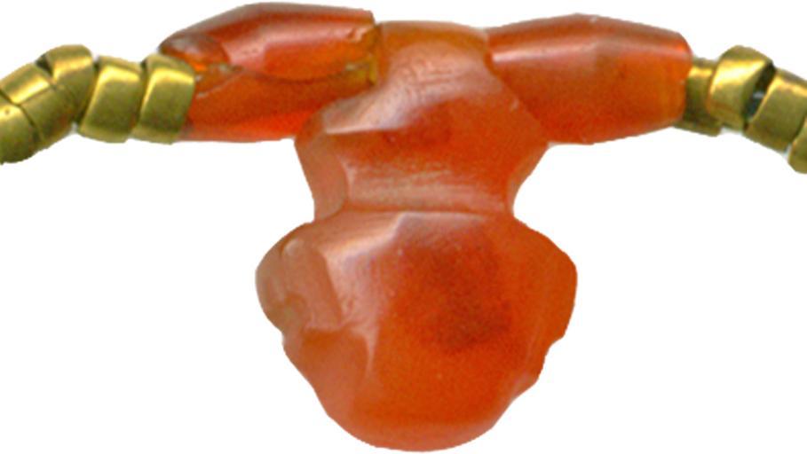 Keywords: Egyptian - Necklace - Walters 571515 - Detail B.jpg This restrung necklace consists of biconical carnelian beads beads of rolled strips of sheet gold and ten amulets The rooster and couchant animal at either end of the necklace cast of a pale yellow metal probably do not belong Below the rooster at left is a tiny heart amulet of carnelian The other amulets are cut out of sheet gold of varying thickness and have rolled sheet gold loops attached to the back Below the couchant animal at right is an amulet showing a man holding palm branches which symbolized millions of years The six remaining figures are hieroglyphs as well The three birds at left probably represent the sacred ibis of the god Thoth although the long body of one and thick bill of another seem more appropriate to ducks Two amulets show the double crown resting on a basket which signified royal power in Upper and Lower Egypt Another basket amulet has something protruding from it between 2000 1600 BC Middle Kingdom gold and carnelian beads Bird cm 0 67 0 38 ; Ib H 1/16 0 2 x 0 05 cm ; Ibis I cm 0 55 0 79 ; Ibis II cm 0 35 0 3 ; Vulture cm 0 48 0 31 ; Double Crown I cm 0 29 0 22 ; Double Crown II cm 0 56 0 43 ; Neb W 1/8 in 0 05 x 0 39 cm ; Heh cm 0 3 0 51 ; Animal W 1/16 in 0 04 x 0 23 cm accession number 57 1515 24820 Henry Walters Baltimore date and mode of acquisition unknown Walters Art Museum Henry Walters Acquired by Henry Walters Jewelry - Ancient to Modern The Walters Art Gallery Baltimore 1979-1980 place of origin Egypt Walters Art Museum license Ancient Egyptian jewellery in the Walters Art Museum Media contributed by the Walters Art Museum needs category review |