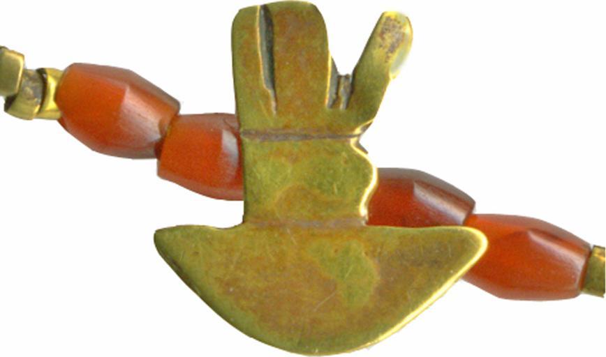 Keywords: Egyptian - Necklace - Walters 571515 - Detail G.jpg This restrung necklace consists of biconical carnelian beads beads of rolled strips of sheet gold and ten amulets The rooster and couchant animal at either end of the necklace cast of a pale yellow metal probably do not belong Below the rooster at left is a tiny heart amulet of carnelian The other amulets are cut out of sheet gold of varying thickness and have rolled sheet gold loops attached to the back Below the couchant animal at right is an amulet showing a man holding palm branches which symbolized millions of years The six remaining figures are hieroglyphs as well The three birds at left probably represent the sacred ibis of the god Thoth although the long body of one and thick bill of another seem more appropriate to ducks Two amulets show the double crown resting on a basket which signified royal power in Upper and Lower Egypt Another basket amulet has something protruding from it between 2000 1600 BC Middle Kingdom gold and carnelian beads Bird cm 0 67 0 38 ; Ib H 1/16 0 2 x 0 05 cm ; Ibis I cm 0 55 0 79 ; Ibis II cm 0 35 0 3 ; Vulture cm 0 48 0 31 ; Double Crown I cm 0 29 0 22 ; Double Crown II cm 0 56 0 43 ; Neb W 1/8 in 0 05 x 0 39 cm ; Heh cm 0 3 0 51 ; Animal W 1/16 in 0 04 x 0 23 cm accession number 57 1515 24820 Henry Walters Baltimore date and mode of acquisition unknown Walters Art Museum Henry Walters Acquired by Henry Walters Jewelry - Ancient to Modern The Walters Art Gallery Baltimore 1979-1980 place of origin Egypt Walters Art Museum license Ancient Egyptian jewellery in the Walters Art Museum Media contributed by the Walters Art Museum needs category review |