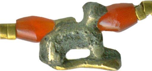 Keywords: Egyptian - Necklace - Walters 571515 - Detail J.jpg This restrung necklace consists of biconical carnelian beads beads of rolled strips of sheet gold and ten amulets The rooster and couchant animal at either end of the necklace cast of a pale yellow metal probably do not belong Below the rooster at left is a tiny heart amulet of carnelian The other amulets are cut out of sheet gold of varying thickness and have rolled sheet gold loops attached to the back Below the couchant animal at right is an amulet showing a man holding palm branches which symbolized millions of years The six remaining figures are hieroglyphs as well The three birds at left probably represent the sacred ibis of the god Thoth although the long body of one and thick bill of another seem more appropriate to ducks Two amulets show the double crown resting on a basket which signified royal power in Upper and Lower Egypt Another basket amulet has something protruding from it between 2000 1600 BC Middle Kingdom gold and carnelian beads Bird cm 0 67 0 38 ; Ib H 1/16 0 2 x 0 05 cm ; Ibis I cm 0 55 0 79 ; Ibis II cm 0 35 0 3 ; Vulture cm 0 48 0 31 ; Double Crown I cm 0 29 0 22 ; Double Crown II cm 0 56 0 43 ; Neb W 1/8 in 0 05 x 0 39 cm ; Heh cm 0 3 0 51 ; Animal W 1/16 in 0 04 x 0 23 cm accession number 57 1515 24820 Henry Walters Baltimore date and mode of acquisition unknown Walters Art Museum Henry Walters Acquired by Henry Walters Jewelry - Ancient to Modern The Walters Art Gallery Baltimore 1979-1980 place of origin Egypt Walters Art Museum license Ancient Egyptian jewellery in the Walters Art Museum Media contributed by the Walters Art Museum needs category review |