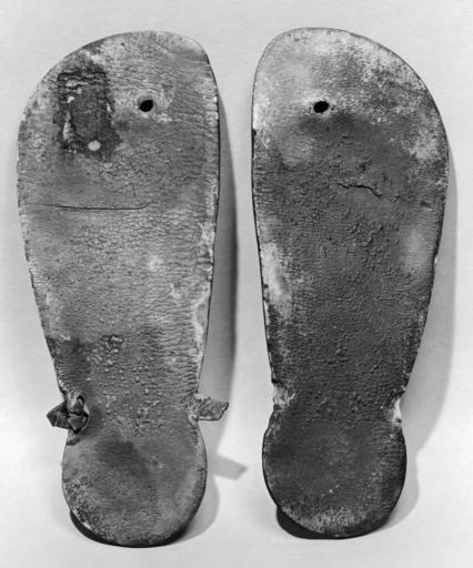 Keywords: Egyptian - Pair of Leather Sandals - Walters 73110.jpg This is a pair of leather sandal soles Each sole consists of a single piece of cut leather There are fine cracks and some areas of discoloration on the reddish-brown leather but generally it is in a good state of preservation The sandals appear to have been worn during life because there are signs of wear on the bottoms and there are molded impressions of the heal toes and the ball of the foot on the upper surface There is a round hole punched into each sole for the attachment of a thong between the first and second toes Leather ankle straps secured the back of the sandal Complete examples in the Museum of Fine Arts have a strap that completely encircles the ankle heel On the right sole only an indentation on each side marks the location of the sandal strap On the left sole a small section of the original strap remains on the right edge and this strap was part of the same piece of leather as the sole On the left edge we have evidence of a repair which is also an indication of daily life use Two holes were punched into the edge of the sole and a new strap was fixed into place by leather thongs Only a short length of this new strap remains in place There is a rectangular area of discoloration on the upper surface of the left sole near the toe area between 1550 1307 BC New Kingdom stitched leather cm 21 8 3 0 5 accession number 73 110 12325 Royal Scottish Museum Edinburgh date and mode of acquisition unknown Private collection Walters Art Museum Henry Walters Anonymous gift 1960 In Search of Ancient Treasure 40 Years of Collecting The Walters Art Gallery Baltimore 1978 place of origin Egypt Walters Art Museum license Ancient Egyptian art in the Walters Art Museum Media contributed by the Walters Art Museum needs category review Sandals of Ancient Egypt |