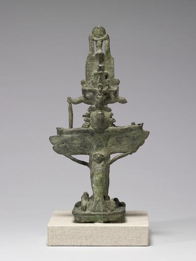 | Keywords: Egyptian - Pantheistic Bes - Walters 54540 - Back.jpg  This depicts a composite deity who has the attributes and therefore the powers of several different gods The face of the god Bes the twin plumes and ram horns of Amun's crown the head of an ibis crowned by the crescent and full moon of Thoth and several snakes and crocodiles can be seen The wings and falcon tail are related to the sky god Horus and the jackal Anubis There are many more aspects which refer to a multitude of divine aspects By incorporating these elements into a single figure the statuette protected the owner from many evils ca 250 100 BC Greco-Roman bronze cm 24 6 13 11 9 73 accession number 54 540 10883 Henry Walters city Baltimore Walters Art Museum Henry Walters Acquired by Henry Walters 1931 place of origin Egypt Walters Art Museum license Ancient Egyptian statues in the Walters Art Museum Statuettes of Bes Media contributed by the Walters Art Museum needs category review |