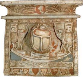 | Keywords: Egyptian - Pectoral with Scarab - Walters 4291 (2).jpg  The ancient Egyptians believed that the dung beetle the Scarabaeus sacer was one of the manifestations of the sun god Representations of these beetles were used as amulets and for ritual or administrative purposes The rectangular shrine shaped pectoral has a large scarab in the center The front displays an adoration scene scarab and baboons in a sun barque The shrine has a cavetto cornice at the top with an incised winged sun disk painted red and a base with lotus flower frieze in red and blue The central scene is additionally framed on the top and side by a color key whose colors are mostly gone The motif displays a scarab in a barque flanked by two baboons in adoration gesture; the mantle of the baboons shows a crossed hatched pattern All three figures have an extra base the one of the scarab decorated with a reed pattern Below the barque is a section with a herringbone pattern representing water In the right and left corner are short text columns with the name Wsjr Osiris The space around the figures was filled with red below the barque with blue color paste The motif is antithetically arranged that the baboons are facing the scarab The scarab's head plates and clypeus front plate are carved; pronotum dorsal plate of the prothorax elytron wing cases and the division between the wing cases are marked by raised borders to confine the color filling pronotum red wing cases blue The extremities are carved and have hatch notches on the upper sides for the tibial teeth and the pilosity hair The reverse of the shrine shaped pectoral displays an adoration scene with Osiris and private worshipper The flat shrine is framed by a cavetto cornice and color key borders with four-line dividers The central scene displays the god Osiris on the left crowned with double-feathers ram horns and cobra serpents He holds crock and flail in his hands and is seated on a block throne with a cushion overlapping the back His name is written in front of his crown The figure on the right side represents the female owner of the pectoral; she wears a long pleated dress a long wig that does not cover the ears and has a lotus flower on her head; she raises her arms in an adoration gesture Above her hands is an inscription containing the name of Osiris Between both figures is an empty oval frame which represents the juvenile sun resting on an dd-pillar with two arms embracing the sun The dominating icon of the scene is the big oval in the center and the two figures to the right and left look slightly built in comparison to it The figure of Osiris fills the whole height of the space including his base and crown indicating an equal importance to the scarab The front and back are executed in raised and sunk relief; the front has also colored past filling The scarab on the front is dominant by its size central position and raised round sculpted forms; the two flanking baboons are also prominent by their size and the very high raised relief; all the other details of shrine shaped pectoral are executed in high relief except the incised wings of the sun disc in the cavetto cornice; the layout is well organized but the scarab and its base in the barque are lopsided; noteworthy are the rectangular raised sections in the upper corners of the image field with the name of Osiris Only the blue and red color has been preserved and it is important to realize that only the scarab has a three-color spectrum red blue and white or yellow/gold The reverse side is more flatly executed the figures are carved in high relief; there are as on the other side two raised rectangular text fields for the incised inscriptions The figures are slender and slightly rough; the garments are detailed with very fine hatch line or dot pattern; the layout is balanced but the figure of Osiris seems slim in comparison to the worshiping lady due to his large crown and high throne base; moreover the central oval frame which originally held a scarab is lopsided The scarab-pectoral is a funerary amulet which was originally attached to mummy wrappings The amulet should assure the renewal of the deceased in the afterlife similar to that of the god Osiris which is why the inscription which names the seated god is the same as the inscription which identifies the worshipping deceased The combination of sun-oval and dd-pillar of Osiris represents the unification of both deities and of the cyclical and the linear aspects of time and eternity; the result is the renewal of both deities of this and the other world as well as the deceased While the reverse of the pectoral focuses on the unification process the front represents the renewal scarab with baboons in the barque and rising of the sun winged sun disc The amulet should guarantee the meeting of the deceased with the sun god and his consequential renewal It is striking that on both sides the scarab is lopsided; it seems to be unlikely that this was just a mistake of a less qualified artist Most probably the lopsided placement has to do with the idea of the sloping celestial path which can be expressed by a lopsided sky hieroglyph The motif of the scarab in the barque flanked by solar baboons is rare on private pectorals of the New Kingdom and more popular on scarabs Walters 42 396 or finger rings see between 1292 1070 BC New Kingdom steatite with color inlays cm 12 5 10 2 9 5 accession number 42 91 14857 Dikran Kelekian New York and Paris date and mode of acquisition unknown Henry Walters city Baltimore Walters Art Museum Henry Walters Acquired by Henry Walters 1929 Translation Osiris Jewelry - Ancient to Modern The Walters Art Gallery Baltimore 1979-1980 Objects of Adornment Five Thousand Years of Jewelry from the Walters Art Gallery Baltimore Cooper-Hewitt National Design Museum New York; Chrysler Museum of Art Norfolk; Carnegie Museum of Art Pittsburgh; San Antonio Museum of Art San Antonio; Philbrook Museum of Art Tulsa; Honolulu Academy of Arts Hono