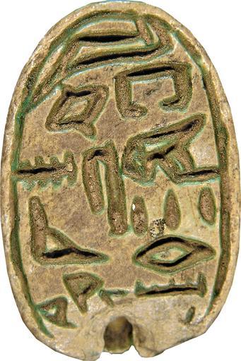 | Keywords: Egyptian - Private Name Seal of Reni-seneb - Walters 4240 - Bottom.jpg  This steatite scarab is inscribed on the flat underside with vertically arranged column writing that name an individual and make a statement of social status The top is carved with a detailed design in deep lines with regular flow The piece is simply made and the workmanship is slightly rough The scarab functioned as a private name seal and user individualized amulet and was originally mounted or threaded The amulet should guarantee constancy of individual existence and social status The name Reni-seneb was very popular in the Middle Kingdom between 1794 1648 BC late Middle Kingdom beige steatite with green-blue glaze cm 0 9 1 6 2 4 accession number 42 40 26216 Henry Walters Baltimore date and mode of acquisition unknown Walters Art Museum Henry Walters Acquired by Henry Walters Transcription Overseer of the office of calculations and distributions Reni- seneb the justified one The flower bunch for the phrase the justified one is reversed Secret Signs Egyptian Writing The Walters Art Museum Baltimore 2003-2004 place of origin Egypt Walters Art Museum license Ancient Egyptian scarabs in the Walters Art Museum Hieroglyphs on scarabs Tongue animal hieroglyph Pustule hieroglyph House pr hieroglyph Knife sharpener hieroglyph |