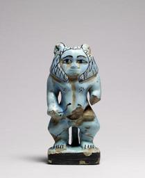 Keywords: Egyptian - Protective Figure of Aha-Bes - Walters 48420.jpg Resembling the protective deity Bes this benevolent demon holds a snake in each hand symbolizing his ability to ward off the bites and stings of venomous creatures The figure has the proportions of a dwarf the head mane and tail of a lion and human eyes Similar figures to this one were depicted on magical wands of the Middle Kingdom The details of the figure such as the eyes mane nipples and the snakes are marked with dark blue lines and dots ca 1800 1750 BC Second Intermediate faience with blue glaze cm 17 2 7 6 4 9 accession number 48 420 37996 William MacGregor Tamworth Staffordshire Sale Sotheby Wilkinson Hodge London June 26-29 and July 4-6 1922 Henry Walters city Baltimore Walters Art Museum Henry Walters Acquired by Henry Walters 1922 place of origin Dra abu'l Naga present-day Western Thebes Egypt Walters Art Museum license Ancient Egyptian statuettes in the Walters Art Museum Ancient Egyptian faience in the Walters Art Museum Bes amulet Media contributed by the Walters Art Museum needs category review |