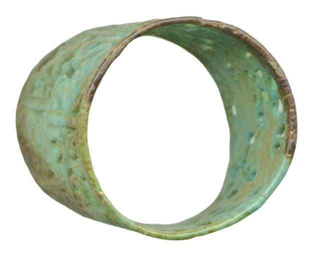 | Keywords: Egyptian - Ring with Horus and Hathor - Walters 481620 - Top.jpg A fragile openwork ring made of faience with designs in superimposed registers of plaques The god Horus represented as a hawk with disk on head one wing up one down foot forward alternates with heads of the cow-eared goddess Hathor In all but one plaque she wears a low crown In one she wears the characteristic heavy wig with spiral curls century 10 8 BC faience with blue glaze H 9/16 x W 7/8 x Outer Diam 9/16 in 1 42 x 2 2 x 1 5 cm accession number 48 1620 1457 Henry Walters Baltimore date and mode of acquisition unknown Walters Art Museum Henry Walters Acquired by Henry Walters Jewelry - Ancient to Modern The Walters Art Gallery Baltimore 1979-1980 place of origin Egypt Walters Art Museum license Ancient Egyptian jewellery in the Walters Art Museum Ancient Egyptian faience in the Walters Art Museum Media contributed by the Walters Art Museum needs category review |