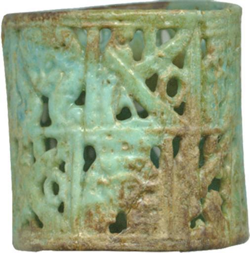 | Keywords: Egyptian - Ring with Horus and Hathor - Walters 481620 - View E.jpg A fragile openwork ring made of faience with designs in superimposed registers of plaques The god Horus represented as a hawk with disk on head one wing up one down foot forward alternates with heads of the cow-eared goddess Hathor In all but one plaque she wears a low crown In one she wears the characteristic heavy wig with spiral curls century 10 8 BC faience with blue glaze H 9/16 x W 7/8 x Outer Diam 9/16 in 1 42 x 2 2 x 1 5 cm accession number 48 1620 1457 Henry Walters Baltimore date and mode of acquisition unknown Walters Art Museum Henry Walters Acquired by Henry Walters Jewelry - Ancient to Modern The Walters Art Gallery Baltimore 1979-1980 place of origin Egypt Walters Art Museum license Ancient Egyptian jewellery in the Walters Art Museum Ancient Egyptian faience in the Walters Art Museum Media contributed by the Walters Art Museum needs category review |
