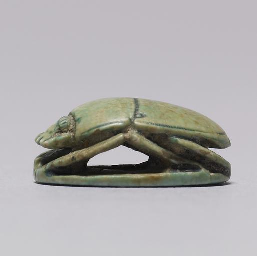 | Keywords: Egyptian - Scarab Amulet - Walters 4258 - Left Profile.jpg The ancient Egyptians believed that the dung beetle the Scarabaeus sacer was one of the manifestations of the sun god Representations of these beetles were used as amulets and for ritual or administrative purposes This scarab displays on the bottom side the figure of the goddess Taweret Her appearance combines a hippopotamus body lion paws crocodile head and tail and human arms and hands The goddess is standing on her hindlegs and her left arm is out stretched in front of her Above the goddess is a human eye It is possible to interpret both icons as hieroglyphs and translate Taweret is watchful The bottom design is linearly incised and hollowed out in sunk relief the depicted eye is done with very fine lines and dominant to the figure of the goddess by its size and placement; the figure of Taweret is for a hippopotamus unusually slender and elongated; the left outstretched arm with the open human hand is very slim and long and fills the empty space in front of the goddess; it is disproportional to her right arm which is placed beside her body; the whole layout is well organized but there is more space between the eye and the upper part of the frame than between Taweret and the lower part The highest point of the back is the partition between pronotum dorsal plate of the prothorax and elytron wing cases Pronotum and elytron have incised borderlines separation lines and V-shaped marks for humeral callosities shoulder thickenings The long-oval head is flanked by quarter-spherical eyes; the irregularly trapezoidal side plates show outside-depressions and the clypeus front plate four serrations The raise extremities have natural form and vertical hatch lines for the tibial teeth and pilosity hair The base is symmetrically oval The bottom design is linearly incised and hollowed out in sunk relief the depicted eye is done with very fine lines and dominant to the figure of the goddess by its size and placement; the figure of Taweret is for a hippopotamus unusually slender and elongated; the left outstretched arm with the open human hand is very slim and long and fills the empty space in front of the goddess; it is disproportional to her right arm which is placed beside her body; the whole layout is well organized but there is more space between the eye and the upper part of the frame than between Taweret and the lower part The scarab is longitudinally pierced was originally mounted or threaded and functioned as an amulet It should secure the protection of the goddess and refer to her watchfulness It might have been created to protect pregnant women or newborn children The figure of Taweret is an unusual variant with a crocodile instead of a hippopotamus head It is also unusual that the goddess has no nb-basket or other element below her feet to function as a baseline between 1070 736 BC Third Intermediate light beige steatite with blue-green glaze cm 1 5 1 1 0 7 accession number 42 58 17657 Henry Walters Baltimore 1929 mode of acquisition unknown Walters Art Museum Henry Walters Acquired by Henry Walters 1929 Translation Taweret is watchful place of origin Egypt Walters Art Museum license Ancient Egyptian scarabs in the Walters Art Museum Scarab amulet Media contributed by the Walters Art Museum needs category review |