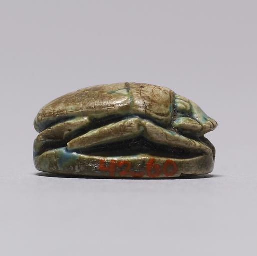 Keywords: Egyptian - Scarab of Hatshepsut - Walters 4260 - Right Profile.jpg The ancient Egyptians believed that the dung beetle the Scarabaeus sacer was one of the manifestations of the sun god Representations of these beetles were used as amulets and for ritual or administrative purposes This scarab has a vertically arranged left reading bottom inscription framed by an oval line It contains the name of the female pharaoh Hatshepsut and an epithet expressing her relation to the god Amun The name of Amun is dominant by size and positioning in comparison to the royal name The hieroglyphs are well carved but slightly irregular and the forms and arrangement typical for the early 18th Dynasty The highest point of the scarabs back is the pronotum dorsal plate of the protorax Pronotum and elytron wing cases have single border and separation lines V-shaped shoulder marks represent the humeral callosities shoulder thickenings The rectangular head has a semicircular insert and is flanked by two-stage quarter-spherical eyes The trapezoidal side plates have curved outer edges and borderlines and the clypeus front plate four frontal serrations and two central base notches The extremities have natural form and show vertical hatch lines on the upper side of the fore- and midlegs for the tibial teeth and pilosity hair The oval base is symmetrical The scarab is longitudinally pierced was originally mounted or threaded and used as an amulet It should secure the special relation between Hatshepsut and the god Amun and provide a private owner with her royal patronage There are many different variations of scarabs with the throne name of Hatshepsut and a variety of different epithets; the epithet beloved of Amun was not only for her a very popular one between 1479 1458 BC New Kingdom light red-brown steatite with green-blue glaze cm 1 4 1 0 7 accession number 42 60 31419 Henry Walters Baltimore date and mode of acquisition unknown Walters Art Museum Henry Walters Acquired by Henry Walters Translation Throne name of the female King Hatshepsut without cartouche and combined with an Amun related epithet Maat-ka-Re beloved of Amun place of origin Egypt Walters Art Museum license Ancient Egyptian scarabs in the Walters Art Museum Hatshepsut Media contributed by the Walters Art Museum needs category review |