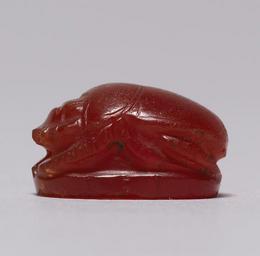 | Keywords: Egyptian - Scarab of Neferu-Re - Walters 4256 - Left Profile.jpg The ancient Egyptians believed that the dung beetle the Scarabaeus sacer was one of the manifestations of the sun god Representations of these beetles were used as amulets and for ritual or administrative purposes This small red carnelian scarab has a vertically arranged bottom inscription which consists of three lines of right reading text with a cartouche in the center An oval line frames the inscription The text contains the name and title of crown princess Neferure daughter of the female pharaoh Hatshepsut and a formula whishing her life The highest point of the back is the pronotum dorsal plate of the prothorax Pronotum and elytron wing cases have fine single borderlines and double separations lines The line flow almost regular only the partition lines between pronotum and elytron overlap slightly The trapezoidal head is flanked by quarter-ovoid eyes The trapezoidal side plates have curved outer edges and the clypeus front plate which is very large in comparison to the head has four frontal serrations and a central base notch The extremities show natural form and vertical hatch lines for the tibial teeth and pilosity hair the background between the legs is deeply hollowed out The oval base is symmetrical The scarab is longitudinally pierced and was originally mounted or threaded It functions as a name seal and user-individualized amulet of crown princess Neferure The scarab should secure the individual existence wish formula who may live divine relation title divine consort and royal status cartouche of the crown princess and the red color her magic protection The material carnelian was especially used for protective amulets and the Egyptians believed that it would intensify the magical potency The scarab could have been a personal amulet of the princess but it is also possible that it was given to a private person to guarantee the crown princess' patronage Scarabs made of dark red carnelian were popular for the female members of the court in early 18th Dynasty between 1479 1458 BC New Kingdom intensive red carnelian cm 1 4 1 1 0 9 accession number 42 56 1633 Henry Walters Baltimore date and mode of acquisition unknown Walters Art Museum Henry Walters Acquired by Henry Walters Translation Name of the crown princess Neferure in a cartouche combined with the priestess title and a wish formula Divine consort / Neferu-Re / who may live place of origin Egypt Walters Art Museum license Ancient Egyptian scarabs in the Walters Art Museum Media contributed by the Walters Art Museum needs category review Scarabs with Wish Formula Neferure |
