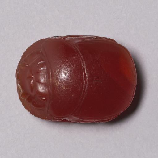 | Keywords: Egyptian - Scarab of Neferu-Re - Walters 4256 - Top.jpg The ancient Egyptians believed that the dung beetle the Scarabaeus sacer was one of the manifestations of the sun god Representations of these beetles were used as amulets and for ritual or administrative purposes This small red carnelian scarab has a vertically arranged bottom inscription which consists of three lines of right reading text with a cartouche in the center An oval line frames the inscription The text contains the name and title of crown princess Neferure daughter of the female pharaoh Hatshepsut and a formula whishing her life The highest point of the back is the pronotum dorsal plate of the prothorax Pronotum and elytron wing cases have fine single borderlines and double separations lines The line flow almost regular only the partition lines between pronotum and elytron overlap slightly The trapezoidal head is flanked by quarter-ovoid eyes The trapezoidal side plates have curved outer edges and the clypeus front plate which is very large in comparison to the head has four frontal serrations and a central base notch The extremities show natural form and vertical hatch lines for the tibial teeth and pilosity hair the background between the legs is deeply hollowed out The oval base is symmetrical The scarab is longitudinally pierced and was originally mounted or threaded It functions as a name seal and user-individualized amulet of crown princess Neferure The scarab should secure the individual existence wish formula who may live divine relation title divine consort and royal status cartouche of the crown princess and the red color her magic protection The material carnelian was especially used for protective amulets and the Egyptians believed that it would intensify the magical potency The scarab could have been a personal amulet of the princess but it is also possible that it was given to a private person to guarantee the crown princess' patronage Scarabs made of dark red carnelian were popular for the female members of the court in early 18th Dynasty between 1479 1458 BC New Kingdom intensive red carnelian cm 1 4 1 1 0 9 accession number 42 56 1633 Henry Walters Baltimore date and mode of acquisition unknown Walters Art Museum Henry Walters Acquired by Henry Walters Translation Name of the crown princess Neferure in a cartouche combined with the priestess title and a wish formula Divine consort / Neferu-Re / who may live place of origin Egypt Walters Art Museum license Ancient Egyptian scarabs in the Walters Art Museum Media contributed by the Walters Art Museum needs category review Scarabs with Wish Formula Neferure |