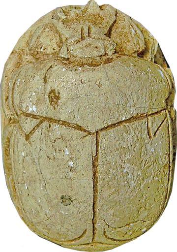 | Keywords: Egyptian - Scarab - Walters 42376 - Back.jpg  The ancient Egyptians believed that the dung beetle the Scarabaeus sacer was one of the manifestations of the sun god Representations of these beetles were used as amulets and for ritual or administrative purposes This scarab has a bottom design that displays King Amenhotep seated on his throne He is dressed in a long pleated shendyt wears the so-called Blue crown with Uraeus-serpent and crown sash The king holds with his left hand the crook in front of his chest and with his right an ankh-sign meaning life The block throne has a small back In front of him is a column with a left reading inscription containing his throne name and title and behind him the hieroglyphs for protection and life The layout is well organized but it is notable that the royal figure does not fill the whole space and that the Uraeus on the forehead of the king is unusually large The highest point of the scarab's back is the pronotum dorsal plate of the prothorax Pronotum and elytron wing cases have deeply incised fine borderlines single separation lines V-shaped marks for the humeral callosities shoulder thickenings and small side-depressions The partition lines between pronotum and elytron meet V-shaped The rectangular head is flanked by triangular eyes The trapezoidal side plates have curved outer edges and borderlines and the clypeus front plate has four frontal serrations and two central base notches The raised slender extremities have natural form; the background between the legs is deeply hollowed out The low oval base is symmetrical The scarab is longitudinally pierced was originally mounted or threaded and functioned as an amulet It secures the existence life protection divinity title Perfect god and royal authority cartouche seated king with scepter for the king and provides a private owner with his patronage and protection between 1388 1351 BC New Kingdom steatite with green glaze and residue of white underglaze cm 1 9 3 3 4 7 accession number 42 376 3211 Henry Walters Baltimore 1930 mode of acquisition unknown Walters Art Museum Henry Walters Acquired by Henry Walters 1930 Translation Throne name of King Amenhotep III with cartouche and combined with divinity title The Perfect God Neb-Maat-Re / Protection and life place of origin Egypt Walters Art Museum license Ancient Egyptian scarabs in the Walters Art Museum Media contributed by the Walters Art Museum needs category review |