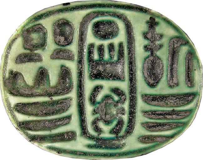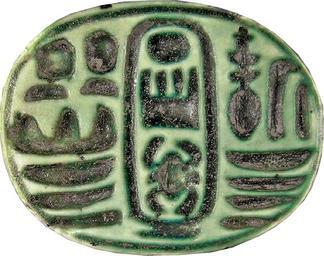 Keywords: Egyptian - Scarab with the Cartouche of Thutmosis III - Walters 4232 - Bottom (2).jpg The ancient Egyptians believed that the dung beetle the Scarabaeus sacer was one of the manifestations of the sun god Representations of these beetles were used as amulets and for ritual or administrative purposes This scarab has a bottom inscription which consists of three columns framed by an oval line; the central column has a royal cartouche The text contains the name titles and epithets of King Thutmose III The inscription is carved in sunken relief The layout is arranged to fit in the oval frame but the two outer columns are not well balanced and some signs collide with the borderline The shape of the hieroglyphs is slightly rough and the nfr-sign has three instead of two horizontal lines The highest point of the back is partition between pronotum dorsal plate of the prothorax and elytron wing cases Pronotum and elytron display incised borderlines single separation lines and V-shaped marks for the humeral callosities thickenings at the shoulders The borderlines of the elytron ends at the rear in half spirals The proportions of the top are unbalanced the pronotum and head section are short in comparison to the elytron The head has long-oval shape the side plates are irregularly trapezoidal and clypeus front plate shows a central base notch The carved extremities show natural form and vertical hatch lines on the upper sides for the tibial teeth and pilosity hair The symmetrical base has a long-oval shape; and the drill-holes of the scarab are framed The scarab is longitudinally pierced was originally mounted or threaded and functions as an amulet This amulet should ensure for its owner support by the royal authority cartouche of the divine king title Perfect God and all-inclusive protection epithet who reverses the foreign countries The scarab was produced after the death of King Thutmose III who was most probably understood as a protective god and successful model of divine kingship The change of the royal title nb t3 wj Lord of the Two Lands to nb t3 w Lord of the Lands may be either a writing mistake or a variant to make the title match to the plural form in the epithet formula all foreign countries The esthetical balance of the signs four horizontal signs at each side of the cartouche may have played a role also between 1292 1186 BC New Kingdom light beige steatite with green-blue glaze cm 0 9 1 5 1 9 accession number 42 32 6551 Henry Walters Baltimore date and mode of acquisition unknown Walters Art Museum Henry Walters Acquired by Henry Walters Translation The Perfect God the Lord of the Lands / Men-kheper-Re / who reverses the foreign countries Secret Signs Egyptian Writing The Walters Art Museum Baltimore 2003-2004 place of origin Egypt <gallery> File Egyptian - Scarab with the Cartouche of Thutmosis III - Walters 4232 - Bottom jpg </gallery> Walters Art Museum license Ancient Egyptian scarabs in the Walters Art Museum Cartouches of Thutmosis III Scarabs of Thutmosis III |