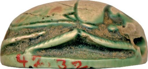 Keywords: Egyptian - Scarab with the Cartouche of Thutmosis III - Walters 4232 - Right.jpg The ancient Egyptians believed that the dung beetle the Scarabaeus sacer was one of the manifestations of the sun god Representations of these beetles were used as amulets and for ritual or administrative purposes This scarab has a bottom inscription which consists of three columns framed by an oval line; the central column has a royal cartouche The text contains the name titles and epithets of King Thutmose III The inscription is carved in sunken relief The layout is arranged to fit in the oval frame but the two outer columns are not well balanced and some signs collide with the borderline The shape of the hieroglyphs is slightly rough and the nfr-sign has three instead of two horizontal lines The highest point of the back is partition between pronotum dorsal plate of the prothorax and elytron wing cases Pronotum and elytron display incised borderlines single separation lines and V-shaped marks for the humeral callosities thickenings at the shoulders The borderlines of the elytron ends at the rear in half spirals The proportions of the top are unbalanced the pronotum and head section are short in comparison to the elytron The head has long-oval shape the side plates are irregularly trapezoidal and clypeus front plate shows a central base notch The carved extremities show natural form and vertical hatch lines on the upper sides for the tibial teeth and pilosity hair The symmetrical base has a long-oval shape; and the drill-holes of the scarab are framed The scarab is longitudinally pierced was originally mounted or threaded and functions as an amulet This amulet should ensure for its owner support by the royal authority cartouche of the divine king title Perfect God and all-inclusive protection epithet who reverses the foreign countries The scarab was produced after the death of King Thutmose III who was most probably understood as a protective god and successful model of divine kingship The change of the royal title nb t3 wj Lord of the Two Lands to nb t3 w Lord of the Lands may be either a writing mistake or a variant to make the title match to the plural form in the epithet formula all foreign countries The esthetical balance of the signs four horizontal signs at each side of the cartouche may have played a role also between 1292 1186 BC New Kingdom light beige steatite with green-blue glaze cm 0 9 1 5 1 9 accession number 42 32 6551 Henry Walters Baltimore date and mode of acquisition unknown Walters Art Museum Henry Walters Acquired by Henry Walters Translation The Perfect God the Lord of the Lands / Men-kheper-Re / who reverses the foreign countries Secret Signs Egyptian Writing The Walters Art Museum Baltimore 2003-2004 place of origin Egypt Walters Art Museum license Ancient Egyptian scarabs in the Walters Art Museum |