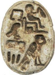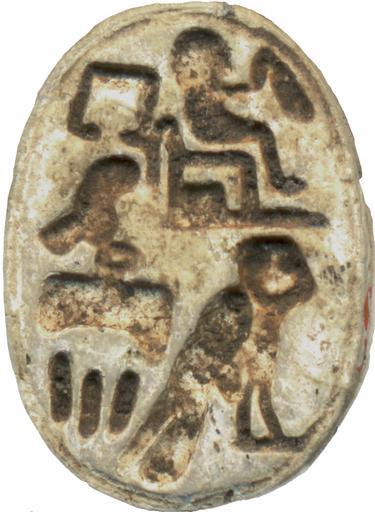 | Keywords: Egyptian - Scarab with Wish Formula - Walters 428 - Bottom.jpg  This steatite scarab is inscribed on the flat underside in sunk relief The vertically arranged column writing is a request to ensure the social status of a member of an elite group The design of the back of the scarab is very detailed with deeply incised lines and slightly irregular line flow The piece is simply made and its workmanship is slightly rough This scarab functioned as a status specific amulet with a blessing for a member of the elite The amulet should express/secure that the owner is notable prestigious and well equipped in the royal court/palace The piece would have originally been mounted or threaded The term Golden Horus as the name of a god does not appear before the Ptolemaic period and it is very unlikely that this scarab dates from that period or that this deity would have been mentioned so early ca 1070 736 BC Third Intermediate steatite light beige with glaze originally blue or green cm 0 7 1 1 1 5 accession number 42 8 28819 Henry Walters Baltimore 1911 mode of acquisition unknown Walters Art Museum Henry Walters Acquired by Henry Walters 1911 Translation May the noble be in the palace of the Golden Horus place of origin Egypt Walters Art Museum license Ancient Egyptian scarabs in the Walters Art Museum Owl m hieroglyph House pr hieroglyph Noble with flail hieroglyph Horus of gold hieroglyph Scarabs with Wish Formula |