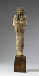 Keywords: Egyptian - Ushabti of Si-Eset - Walters 22185.jpg This ushabti depicts a mummified figure with arms folded on the chest The figure has long hair painted black a hoe in the right hand and a mattock in the left There is an inscription on the front incised and filled with blue paint between 1250 1150 BC New Kingdom wood with blue and black paint cm 22 7 accession number 22 185 11376 Dikran Kelekian New York and Paris date and mode of acquisition unknown from Upper Egypt Henry Walters city Baltimore Walters Art Museum Henry Walters Acquired by Henry Walters 1914 Translation Overseer of the Marshlands Sa-saty; Inscription Extract from Chapter 6 of the Book of the Dead place of origin Mexico Walters Art Museum license Ushabti in the Walters Art Museum Ushabti of the Egyptian New Kingdom |