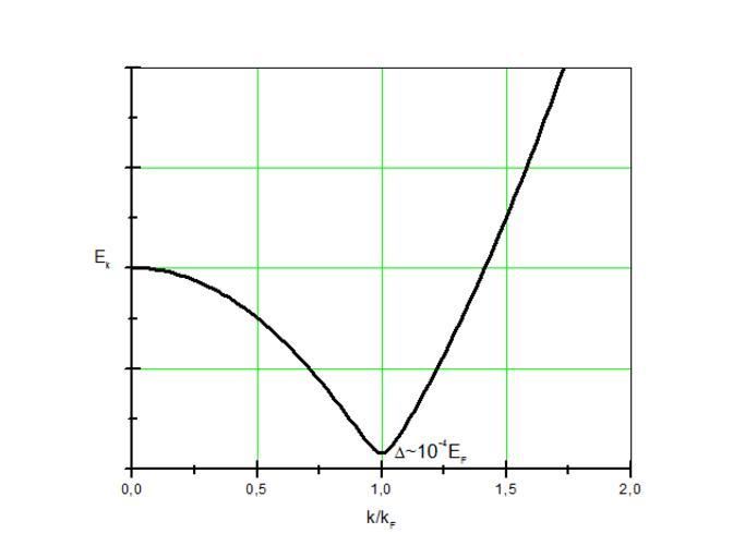 Keywords: Ek superconductor (teoría BCS).png es E<sub>k</sub> es en el marco de la teoría BCS la diferencia de energía entre un sistema en que todos los electrones están en estado superconductor formando pares de Cooper que sería el estado fundamental y ese mismo sistema con un único electrón desapareado en el estado k que es el primer estado excitado Puede parecer que en principio si un par de Cooper se rompe deberíamos tener como mínimo dos electrones desapareados; sin embargo si consideramos un sistema que permite intercambio de partículas la excitación más baja posible corresponde a la de un único electrón desapareado y no dos k/kF es la razón entre el momento de dicha partícula y el momento de Fermi Δ es la banda prohibida superconductora que es la energía mínima que necesita un electrón para pasar al estado normal Si la que recibe un electrón apareado es inferior a Δ este no tendrá ninguna posibilidad de pasar al estado normal La función se ha realizado por aplicación directa de la función <math>f x \sqrt x 2-1 2-0 08 2 </math> que pretende emular mediante constantes arbitrarias el comportamiento de <math>E_k \sqrt \epsilon_k 2+\Delta 2 </math> donde ε<sub>k</sub> es la energía cinética sobre el nivel de Fermi de una partícula de momento k <math>\epsilon_k \frac \hbar 2 \vec k 2 2m - \epsilon_F \frac \hbar 2 \vec k 2 2m - \frac \hbar 2 \vec k _F 2 2m \epsilon_F\left \vec k / \vec k _F 2-1\right </math> Own 2008-03-24 Eynar Superconductors |