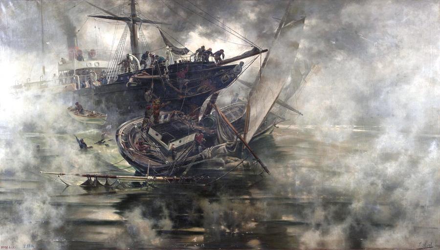 | Keywords: El choque, de Salvador Abril (Museo del Prado).jpg La obra representa una colisión o choque entre dos barcos 1892 oil on canvas Size cm 400 230 Institution Museo del Prado Depositado en la Institution Diputación Provincial de Burgos https //www museodelprado es/coleccion/obra-de-arte/el-choque/aac9ffca-033f-411b-97a8-9d032e97a314 accession number P05951 https //content3 cdnprado net/imagenes/Documentos/imgsem/aa/aac9/aac9ffca-033f-411b-97a8-9d032e97a314/41aed095-d112-4ab5-8eca-8969421cf8d2 jpg PD-old-100 19th-century oil marine paintings Salvador Abril y Blasco Spanish 19th-century paintings in the Museo del Prado 19th-century paintings in the Museu de Belles Arts de València 1892 paintings in Spain Paintings in the Diputación Provincial de Burgos |