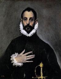 | Keywords: El Greco Nobleman self-portrait.JPG El caballero de la mano en el pecho by El Greco from Prado in Google Earth jpg en Nobleman with his Hand on his Chest Possible self-portrait of El Greco <ref> cite book BuendÃa José Rogelio El Prado básico Una visión del museo a través de los estilos Silex Ediciones 2001 172 8477370915 9788477370918 EL GRECO Domenicos Theotocopuli El caballero de la mano al pecho 1576-1578 Óleo sobre lienzo 81 x 66 cm C 809 ¦ Mucha literatura se ha hecho sobre este prodigioso retrato no añadiremos más ¦ posiblemente de éste lo tomarÃa El Greco ya que trabaja con él en Venecia Ricardo Baroja y Willumsen han creÃdo interpretando el gesto como afirmación del ego que se tratarÃa de un autorretrato </ref> 1583-85 Oil on canvas 81 x 66 cm Museo del Prado Madrid http //www wga hu/cgi-bin/highlight cgi file html/g/greco_el/07/0703grec html find chest Creator El Greco 1583 References reflist PD-old-100 The Nobleman with his Hand on his Chest El Greco Images from Web Gallery of Art Self-portraits |