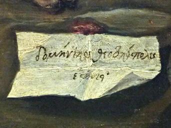 | Keywords: El Greco - St Andrew and St Francis (signature detail).jpg  Artwork Q5841454 Creator El Greco Detalle de la obra representa al apóstol San Andrés que era hermano del apóstol San Pedro junto a San Francisco de Asís fundador de la Orden de los franciscanos Detail from the lower right corner of St Andrew and St Francis showing El Greco's signature Museo del Prado Madrid Λε τομέρεια α ό το κάτω δεξιό μέρος του  ίνακα Ο Αγ Ανδρέας και ο Αγ Φραγκίσκος στην ο οία φαίνεται η υ ογραφή του ζωγράφου  ουσείο Πράδο  αδρίτη ~ 1595 Oil on canvas size cm 167 113 Institution Museo del Prado Sala 009B https //www museodelprado es/coleccion/obra-de-arte/san-andres-y-san-francisco/4c244b9b-076f-4468-9ddc-4dd63dbf72dd object history credit line accession number P02819 own PD-old-100 cc-by-sa-4 0 St Andrew and St Francis El Greco Details of paintings by El Greco |